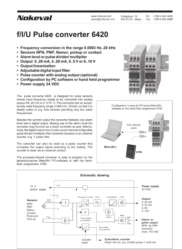 脈沖轉(zhuǎn)換器6420設(shè)計(jì)用于需要將輸入頻率轉(zhuǎn)換為0/4...20 mA或0...5/10 V模擬輸出的脈沖傳感器,該轉(zhuǎn)換器的頻率范圍非常寬,為0.0003 Hz...20 kHz,因此非常適合提供非常低脈沖頻率的流量傳感器。 除了電流輸出,轉(zhuǎn)換器還具有一個(gè)報(bào)警電平和一個(gè)數(shù)字輸出。利用報(bào)警電平,轉(zhuǎn)換器也可以作為一個(gè)批處理控制器來(lái)使用。另外,數(shù)字輸出可以作為一個(gè)內(nèi)部可配置的脈沖分壓器/乘法器,將脈沖傳輸?shù)酵獠坑?jì)數(shù)器,例如1個(gè)脈沖/升。 轉(zhuǎn)換器也可以作為脈沖計(jì)數(shù)器,根據(jù)縮放增加輸出信號(hào)。計(jì)數(shù)器通過(guò)一個(gè)外部觸點(diǎn)進(jìn)行復(fù)位。 基于處理器的轉(zhuǎn)換器很容易通過(guò)通用的MekuWin PC軟件或手持式編程器6790進(jìn)行編程。