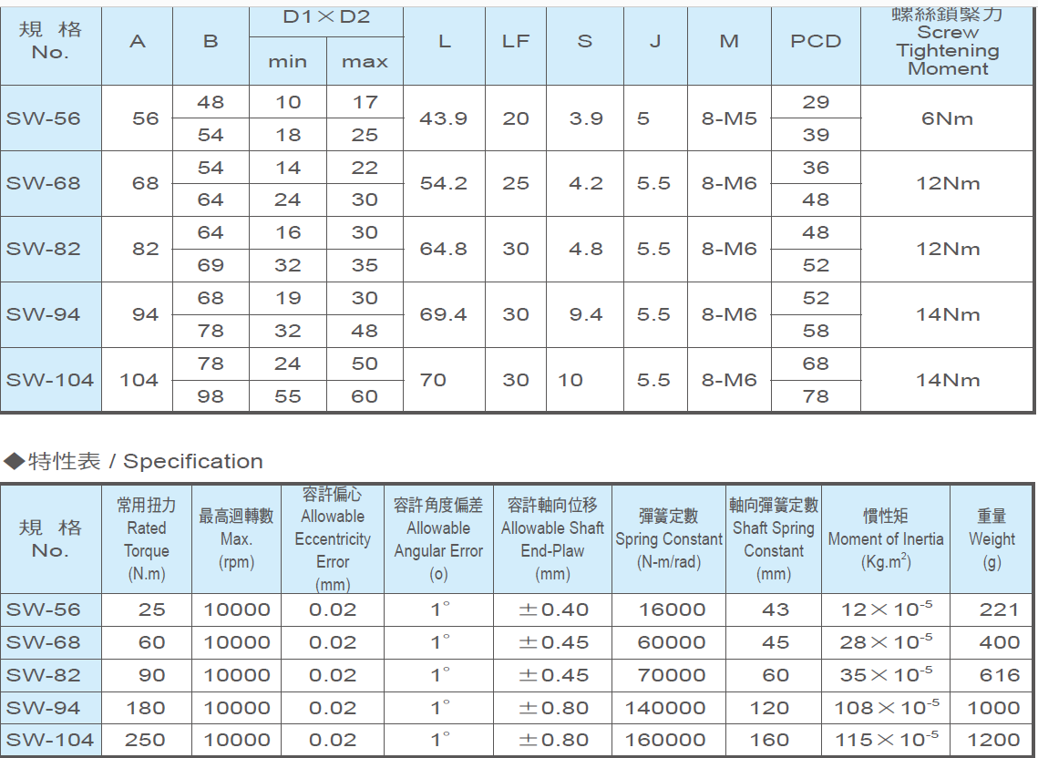 仕勛SW-56 SW-68 SW-82 SW-94高剛性.高扭矩聯軸器是連接兩軸使之供回轉並傳遞安全轉矩的一種機械裝置。一般聯軸器可分為撓性與剛性聯軸器兩